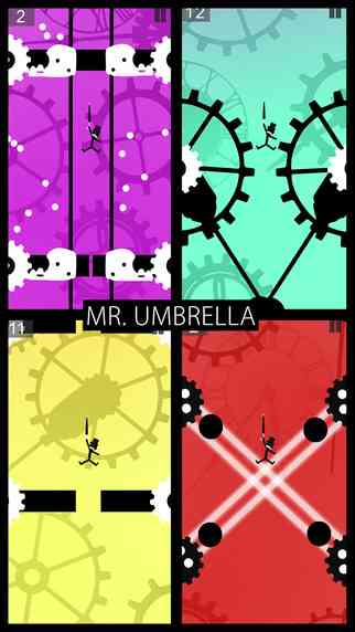 这是一款画面风格简约, 音乐朴实无华,玩起来却格外有难度的极限挑战游戏。游戏中玩家将操作一个戴着绅士帽拿着洋伞的小人, 从高处落下穿过许许多多齿轮以及它们之间传送的黑带、 内卷。 黑球。点击屏幕即可让小人撑开伞暂停在空中一瞬间,从而避开黑带和黑球,如果一不小心碰上了小人就会粉身碎骨!