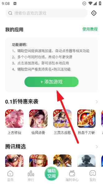 3、 再说说我们就可以选择添加游戏啦,辅助空间的功能非常多,比如游戏加速、自动电击器、多开等。