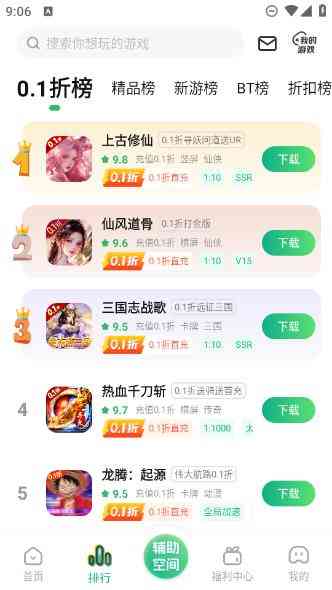 0.1折游戏助手是一款拥有海量游戏资源的福利折扣游戏, 在这里大家能领取到海量游戏礼包,一进入游戏直接就能跳过新手阶段,秒变大神玩家,除此之外游戏盒子内还有各种0.1折游戏,每一款游戏的制作水准都十分精良,动作格斗、策略回合、卡牌养成等等满足不同玩家的不同喜好,喜欢玩游戏的朋友们快来uzzf吧,加油!!