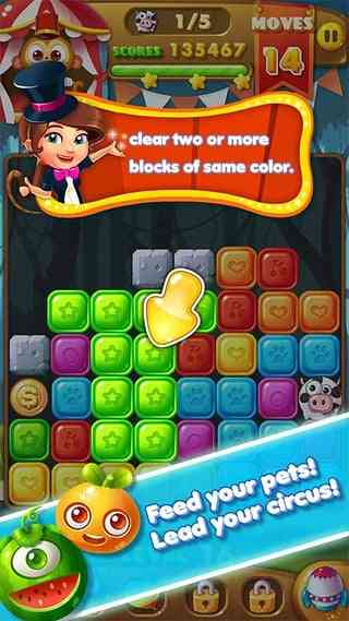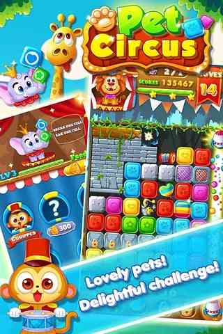 性价比超高。 《宠物马戏团 Pet Circus》一个全新的益智游戏。Ezjoy必将带给您一个愉快的旅程,并且完全不同于你以前玩过的!点击两个或两个以上相同颜色的块,收集食物喂宠物,带领你的马戏团成长吧!