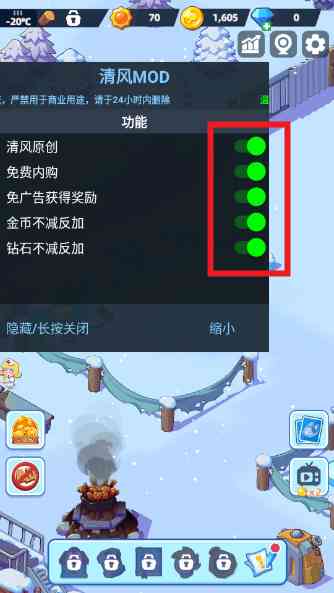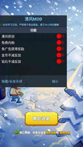 摆烂。 2、 点击图标,我们即可看到清风mod,辅助功能包括免费内购、免广告、金币和钻石不减反增等。