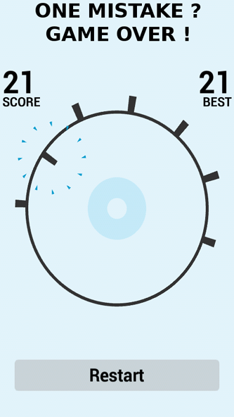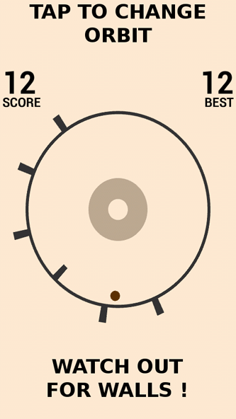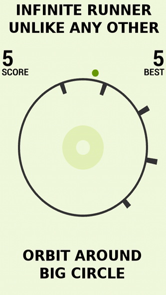 环形跑酷 Orbit Run是一款极为简洁的跑酷类游戏。注意啦,这个游戏可非常考验你的反应能力。游戏内容非常简单, 在圆圈上, 改进一下。 有一个点不断绕着这个圈转动,而圈上会随机生成朝内或者朝外的墙,你需要点击屏幕将圆点换到圈内或者圈外来躲避它们。准备好了吗?
