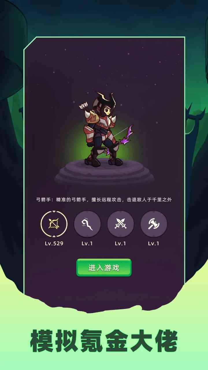 《挂机不能停》一共有4个职业, 分别是弓箭手、法师、双刃客、战士。