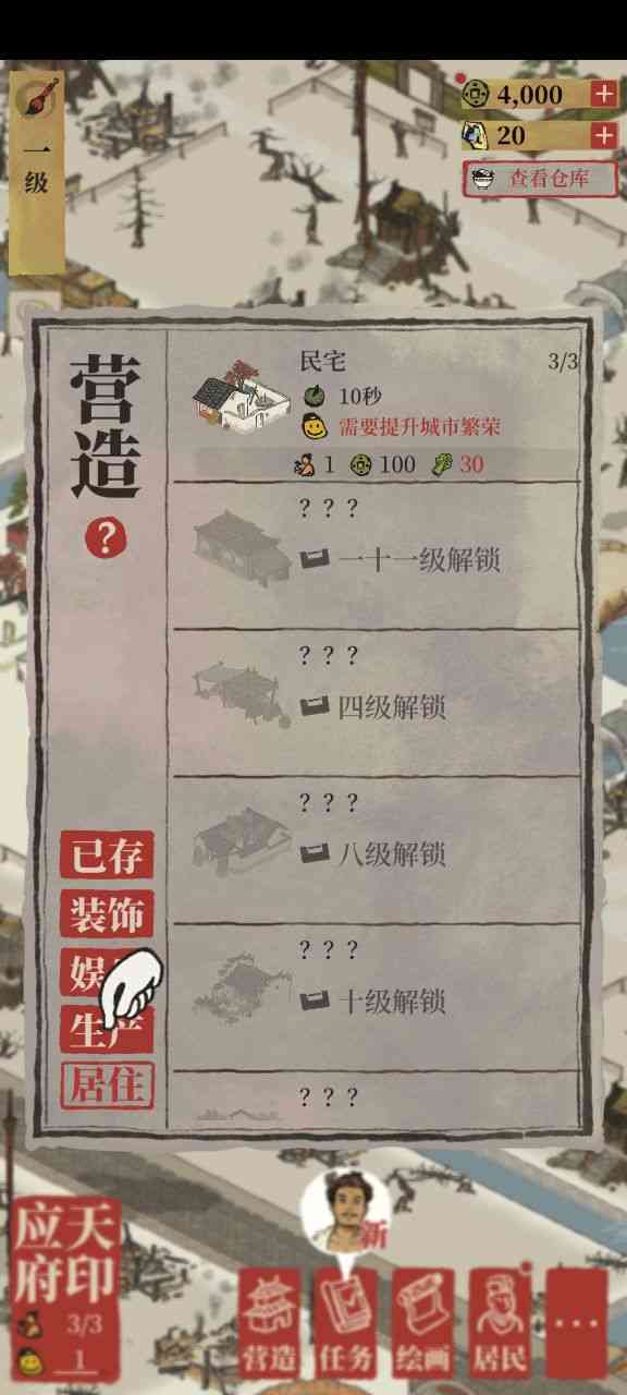 让我们一起... 玩家一开始游戏,总不能让堂堂才子文徵明露宿街头吧,于是就需要安排他入住“民宅”。民宅不光能住人,还能“收税”,每过一定的时间,就能从此处拿到铜钱。与《模拟城市》里的“金钱万能”不一样,在《江南百景图》里要想造一座房子,光有钱也不行。比如民宅,除了100铜钱,还要30“蔬菜”才行。蔬菜从哪里来呢?花50铜钱,就能造出一片农田,再安排种田,就能收上“蔬菜”。