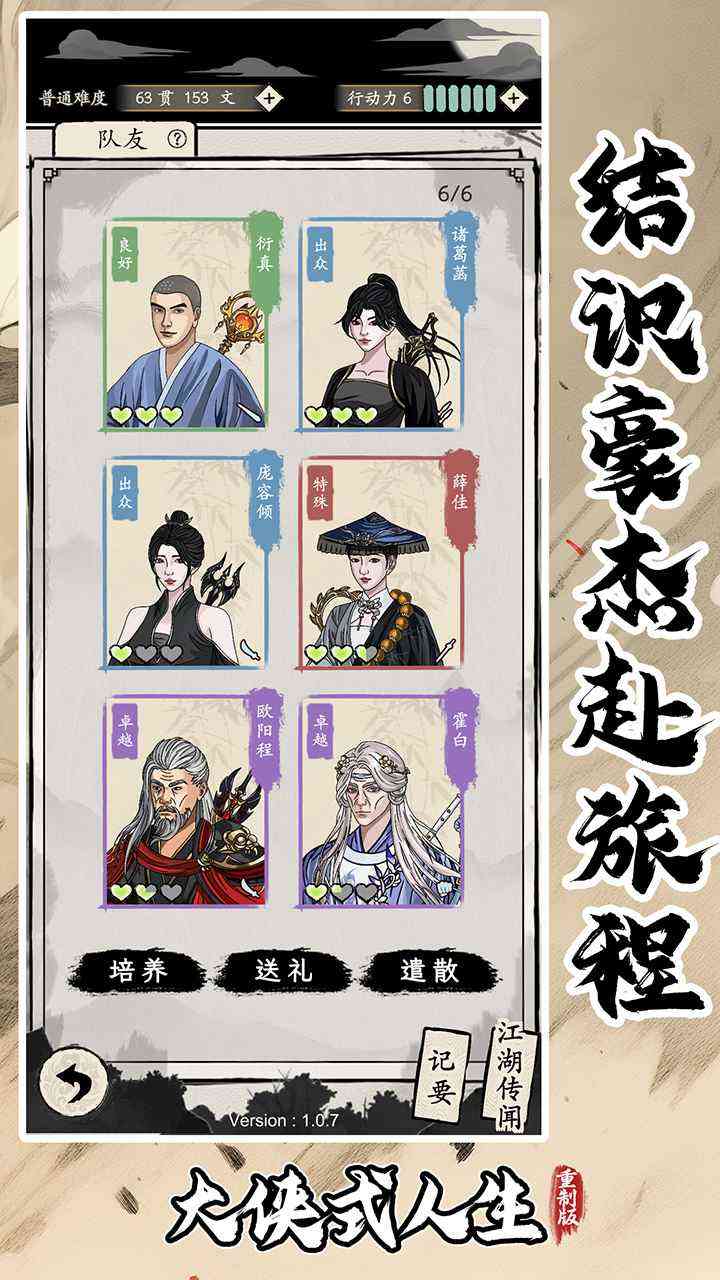 1.开启多线剧情—除了丰富基础的主线剧情和寿命设定外 游戏将会根据你的每一次抉择衍生出随机性质的剧情事件, 我满足了。 让你的武侠人生显得独一无二。 2.加入各大门派—在这个江湖里有众多门派屹立, 在各个门派里不仅可以习得独特的新武学,还能让你体验正反派各自专属的剧情,换个思路。。 3.自创绝世武功—当你大有所成, 成为一派掌门后将可以有机会创造属于自己门派的武功绝学,并自定义你认为意义非凡的武功名字了进而 响彻江湖。 4.体验侠客人生—除了经典的人生模式外 还可以体验其他侠客的个性人生, 说白了... 去参与那些独特有趣的人生剧情。 5.多重难度人生—在常规的人生模式里 我们也将增加其他的难度,在其他难度的人生里也会有一些专属的挑战和NPC可以接触到,让喜欢挑战高难度的童鞋们也能有其他的选择。 6.还原经典战斗—我们会最大程度地保留前作的战斗机制, 让不同武器依旧在战斗中能直观地感受到攻击范围、伤害等差异,一边会优化一些招式的示范范围,让战斗尽量更合理些。 大侠式人生重制版新手攻略 10武功:不管啥门派, 九阳玄铁4桃花,2千变2致命就行了玄铁剑永远的神,快速冲经脉,10W战就退隐江湖; 12武功:5千变2桃花2青龙2致命,追求暴力就还是玄铁剑,轻轻松松一刀2W血; 工具队友:黄蓉—软猬甲,郭襄—倚天剑,谢逊—屠龙刀,其他顶级武器没怎么玩,欢迎补充; 常驻队友:达摩 顶肉,杨过 顶C,石破天 降伤; 过渡内功:无相神功,快速升功力必备; 一阵见血。 小贴士: 1、很多萌新卡武学上限,推荐必学绿色武功终南山练武场金雁功,桃花岛比武亭碧海潮生剑,偷师就行了我从来不给钱??图鉴那可以看到武功出处 2、 想刷地图江湖传闻的,可以在点下一个月前换下武器,把功力降低,下个月那些什么官兵大盗之类的就好打; 附12武功10行动力40岁玄铁剑退隐图和屠龙刀神刀斩,速度加成不知道干啥的,感觉没实装,全图跑很欢乐。 勇敢一点... 1、 快速成为掌门:门派任务接贡献最多值,每个月颁布任务如果不是最大值就叉掉进程,重进就行,根据身份最大值分别是50-80-120-180-300或者450; 2、比武:当掌门后活动—比武有行动力可刷满6个,主要原因是后面武功给完后会给随机铭刻用的石头,比武可增加门派升级速度; 3、门派建设,最高5级,5级后只升战斗力凝聚力就行了2级解锁铭刻,4级解锁自创; 4、铭刻:可以给装备打上额外词条和属性加成,武器铭刻开始没法打有bug,我后面莫名其妙又可以了铭刻需要石头,前期石头的主要来源是江湖传闻①2人冲突劝架②打官兵③打盗贼④保镖师⑤仇家追杀⑥杀财主; 5、闭关:自创武功太拉胯了玄铁剑YYDS; 6、侠客岛:给不少忘尘丹和寿命药,寿命上限好像是120,侠客岛总共1000层,通过后给称号武诸葛。 大侠式人生重制版最强十武学构筑推荐 开局锦囊, 李白懒惰血滴子,三国丹药防御,从医无为而治大巧不工,30名望,45根骨15体魄,这套答案适用所有门派只需要更换武器即可,这里推荐进入长生门。主要原因是越属性越高练功效果越低, 所以先练功加属性,19岁的时候再开始修习功法,20岁过完主线出门派后可以招募队友,队友可以通关送礼和切磋增加好感,好感满一颗心,队友会布置任务,完成任务的奖励可以在记要里查看,一般资质越高的队友的任务也越难,体力优先做门派任务和优质传闻,多的体力去刷锦衣卫或镖局刷侠义攒钱去买蓬莱帮的迷踪剑法,也可以切磋队友,学习的过程中门派还会给寒光神针上卷,这时候就凑齐了4长生,2寒冰, 你没事吧? 2调息,棍法和拳掌30武学修为后买的十方寨的鸳鸯连环棍和蓬莱帮的芙蓉掌,蓝色武学是可能在少年武林大会刷出来的,有条件的可以刷一下这时候凑出4长生,3寒冰,2调息,3灵动,3千变,2蓬莱,招募到诸葛雅后刷追魂阁把侠义刷下去,招募长生门任千殇,学习摧魄神功凑2化境就好了到这时候完全不卡修为,攒钱学技能升战力一直循环,然后就是等门派升职,战力够了去做韩境城的天元神功任务就行,别的都是靠当掌门后比武拿的,当掌门后尽量多比武,比武给别的门派的秘传武学,给完给各种石头还能加速门派发展 到头来武学搭配如下 长生门 摧魄神功 离尘神功 自创武学 十方寨 九鼎神功 鸳鸯连环棍 震山功 蓬莱帮 迷踪剑法 芙蓉掌 玄女斋 九天玄女功 江湖 天元神功 防具用长生门左丘子送的,称号选择依次是体魄,根骨,身法,臂力,铭刻选择2阴柔 自创武学点数6.1.6.7有20次改良,武器随意,选防御最高的就行,最高应该是可锻造120防的拳套或者真武教葛师古送的剑最高拿到过130防御,风格选择调息或者玄阴,范围肯定选最大的周围大范围圆形,特效洗坚守3 总计应该是4十方,4长生,2蓬莱,1江湖,3灵巧,3千变,3擒拿,2化境,2阴柔,1纯阳,1玄阴+2调息或者2玄阴,一共11到12个连锁 思路就是肉然后造脱臼让自己更肉,放弃2门初始武学的十方寨选择长生门的原因是长生门的门派加成是根骨和身法,而十方寨是臂力体魄,臂力对这套的加成实在太小了。坚守3配合天元神功的概率翻倍, 翻倍了就是60%防御,输出低点的背击大招都可能打出1来4长生的回血,化境,玄阴,调息来保证坚守不中断和回血以及控制的频率 太刺激了。 队友选择的葛师古或韩境尘以及丁秀才,葛师古和韩境尘是最肉的两个,主角用暗器时这俩一起上,转自建武学的时候选一个上,丁秀才的3天耀会配合最高威力的女娲补天式可以打