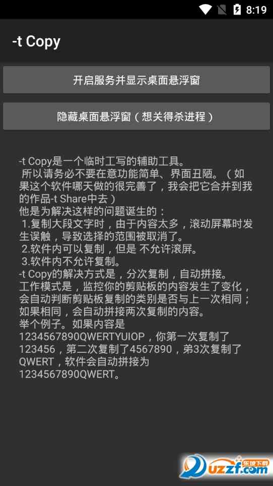 -t Copy是一个临时工写的辅助工具。所以请务必不要在意功能简单、界面丑陋。如果这个软件哪天做的很完善了我会把它合并到我的作品-t Share中去,弯道超车。。