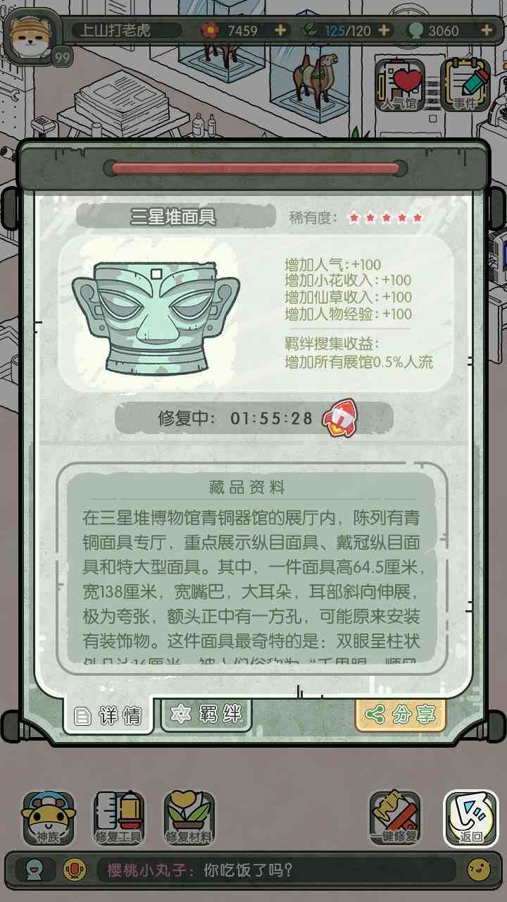 ⑦打扫展馆:开馆的时候打扫展馆也可以获得一定数量的碎片和材料。但是开馆需要人气, 而人气是通过文物展览来提升的,文物稀有度越高人气越高,除此之外给文物升星也是可以提高该文物的展览人气的。