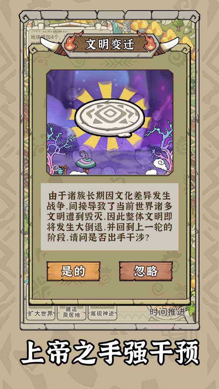 内容玩法上,玩家扮演一名创世主,只能看到不同种族内部各种数值,如“领地、文化、神器”,因为游戏发展,还有“英雄、矿区、圣物”等等;而玩家所需要操作的,就是不断点击确认而已,他破防了。。
