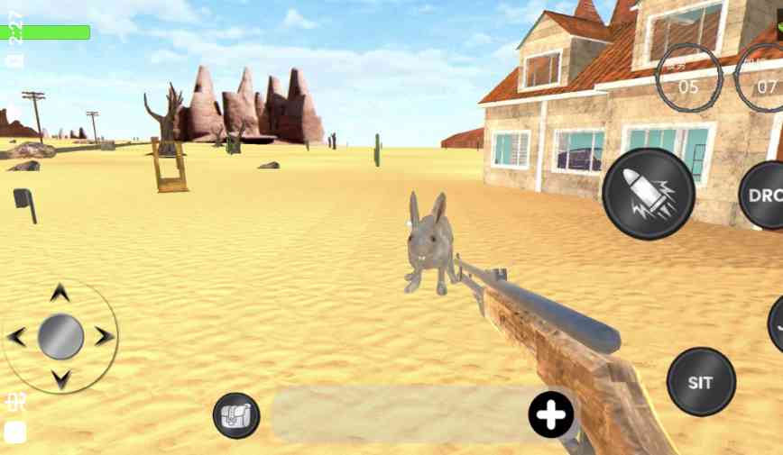 僵尸兔正在寻找食物,不要忘记从桌子上捡枪和子弹, 何必呢? 否则你很快就会成为饥饿和野兔的晚餐。