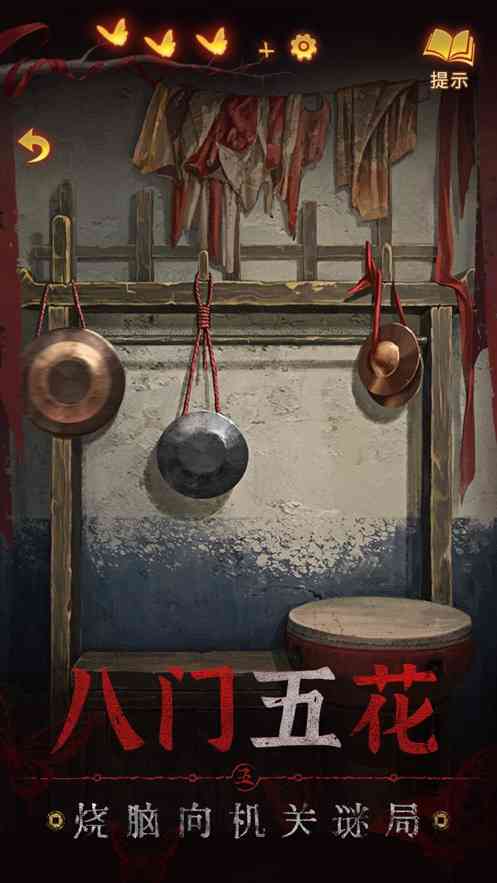 5、 点击门板,用朱砂笔将门上的图案一笔连成;进入第三间,点击小木桌,拿到小木棍并获取鼓锣顺序;先将封条放在木箱上,然后点击红布将其拉下;按顺序敲锣打鼓,开启木箱,人间清醒。。