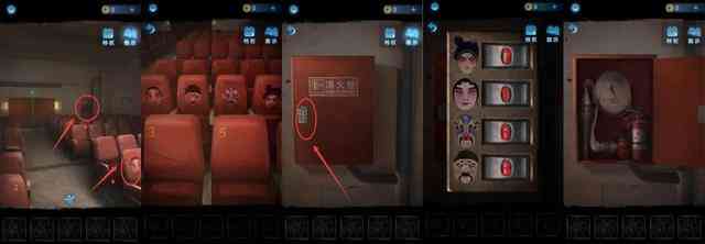 1、 点击带脸谱的座椅,将对应脸谱的数字记下; 躺平。 点击消防柜,输入密码7153,拿到灭火器。