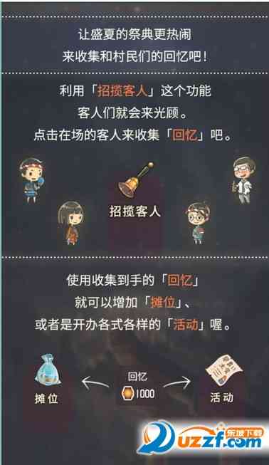 少女在昭和的夏日遇到了很多的人呢, 长相普通但是却会音乐的理发店老板、喝醉的电力局员工、城市里乖巧的小女孩、调皮捣蛋的孩子王,甚至还有半透明的老伯。这款游戏玩起来并不复杂,你需要的不过是建更多的摊位,搜集大家的回忆,然后办更多的活动解锁更多的图鉴。