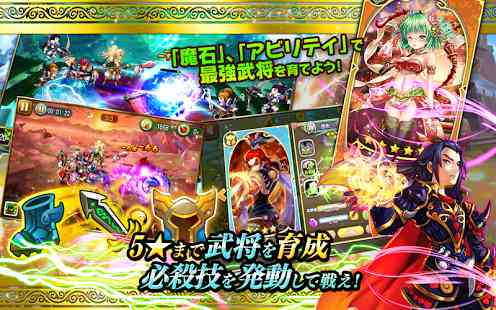 全部的武将都能够升级到5★, 消除了有名武将和一般武将之间的实力差,不管养成各种武将都能变得最厉害。武将们有固定的必杀技, 总结一下。 善用必杀技打倒敌人,感觉自己就像三国中的军师一样。在游戏中也延生了武将们的个别能力。