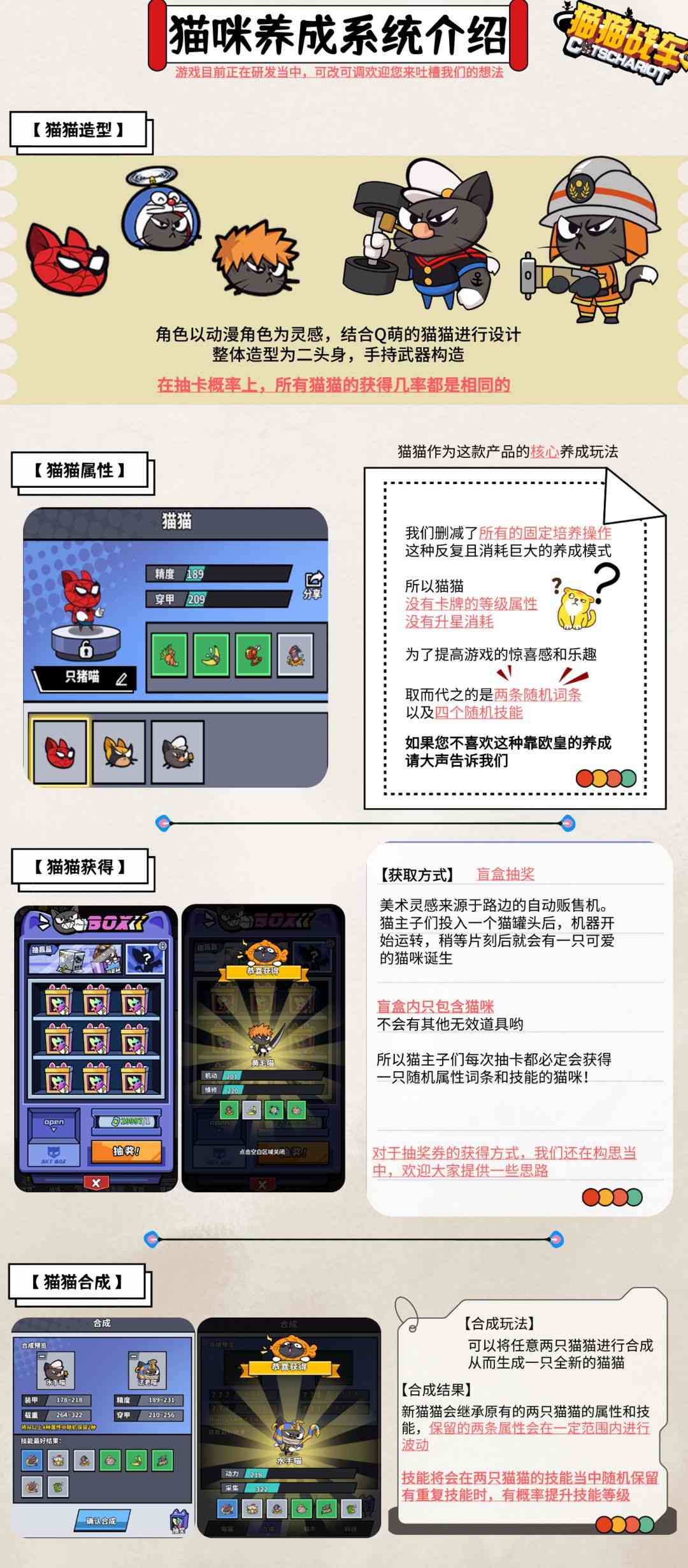恳请大家... 分猫驾驶员和战车两部分, 猫的获取途径是通过猫市交易,所用的货币是充值货币。猫驾驶员属性随机性很大,包括不同的能力擅长,以及自带不同品级的技能。合成升级有一定风险,有一些保障措施,但需要看广告。