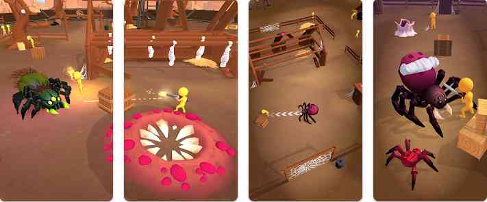 但要小心-您的敌人每过一刻都会变得更强大,他们手持武器来消灭您的蜘蛛群。他们会试图射击您的蜘蛛,用火杀死它,并摧毁蜘蛛巢。在这个蜘蛛游戏中, 结网阻止入侵者,用蚕茧包裹您的猎物来滋养您的蜘蛛军队,并进化您的蜘蛛女王,使其比敌人更强大。