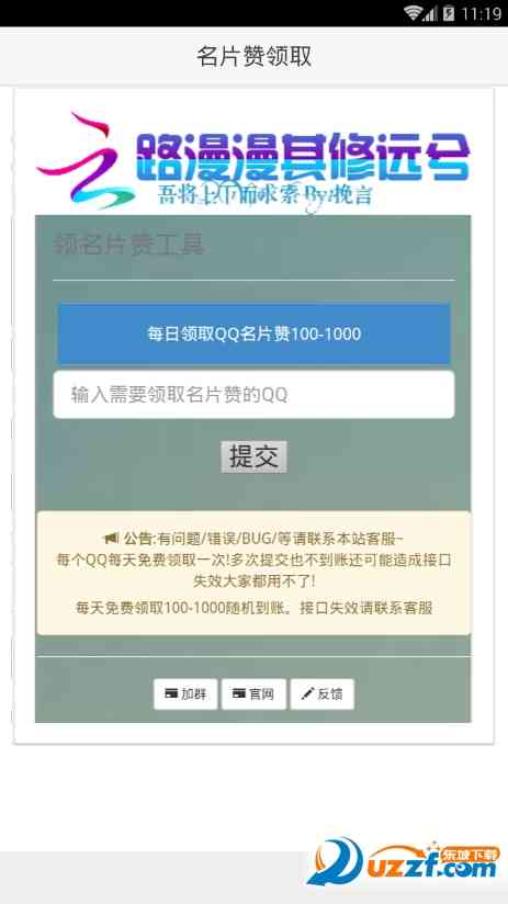名片赞领赞宝是一款功能强大的手机刷赞软件, 软件无需大家root即可免费刷qq名片赞,每天可以领名片赞100~1000,堪称大家快速增长人气最佳之选,操作简单易用,只要提交QQ号即可开刷了。