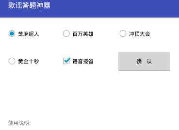蚌埠住了! 歌谣答题助手是由网友自制开发的一款答题助手软件,软件于2018年二月正式推出。自歌谣答题助手问世以来便受到了上千网友的热情使用。目前, 歌谣答题助手支持芝麻超人、百万英雄、冲顶大会、黄金十秒等热门答题软件平台,并且全部答案都精准为你推送,让你的答题之路更加顺畅。