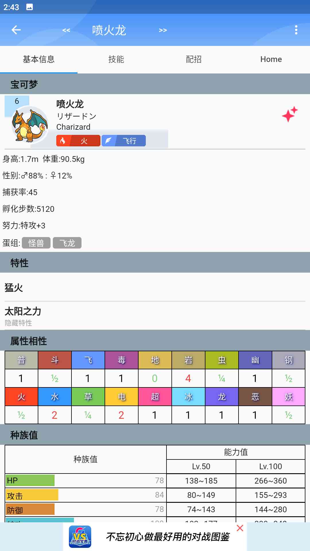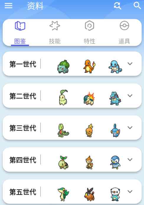 每个世代标题处, 会有当代御三家的图片,用户只要点击某一个世代,就能看到该世代所有宝可梦的列表,以为例。点击,看到波波的详细技能,下拉可查看详细信息,特性、蛋组、种族值以及进化链。