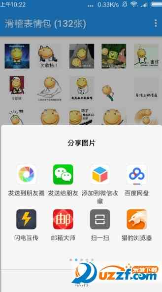 3. 分享与收藏, 乐趣无限喜欢的表情包可以分享到朋友圈,或者添加到微信收藏,还可以分享到百度网盘、闪电互传、邮箱大师、猎豹浏览器等,让你的快乐与更多人分享。