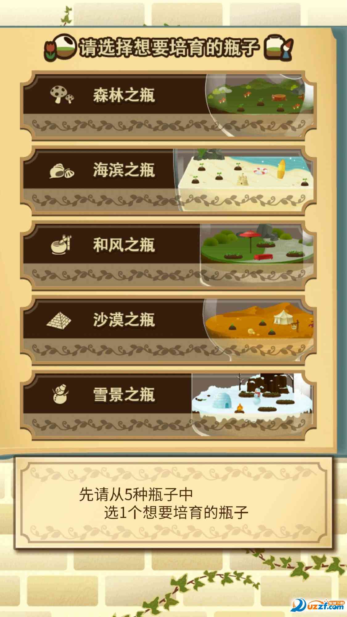 也是没谁了... 瓶中花园是一款画风很清新的建花园游戏, 玩家可以选择各式的风格,在瓶子里养植物,共有5个场景深林,海滨,和风,沙漠,雪景可以选择,玩家趣味性强,自由度高,很丰富耐玩。