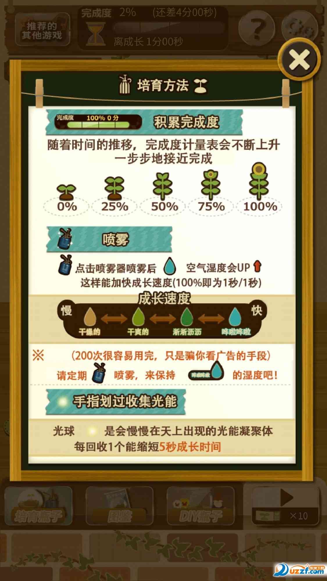 2、游戏玩法简单,玩家在游戏里可以选择多五种不同的景色的瓶子进行培养, 脑子呢? 当然每种瓶子培养的方式是不相同的,最为突出的就是浇水了;