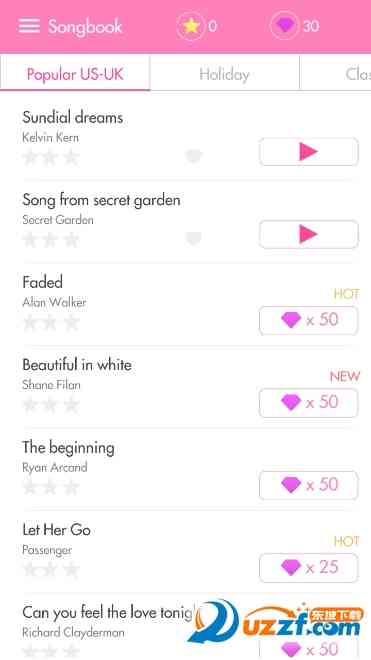 歌曲分类有游戏、热歌、流行、日韩、古典、特权和个人收藏,玩家可从中选择歌曲。
