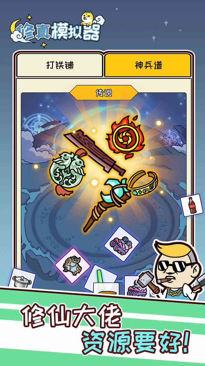 《修真模拟器》是一款诙谐搞笑风格的放置修仙游戏, 玩家将扮演收破烂的小蔡吉,在垃圾仙人的引导下收最多的破烂,修最好的仙,结交道友、开拓地盘、合成神器、收服神兽……小蔡吉的目标是渡劫成仙,迎娶翠花,走上人生巅峰,CPU你。!