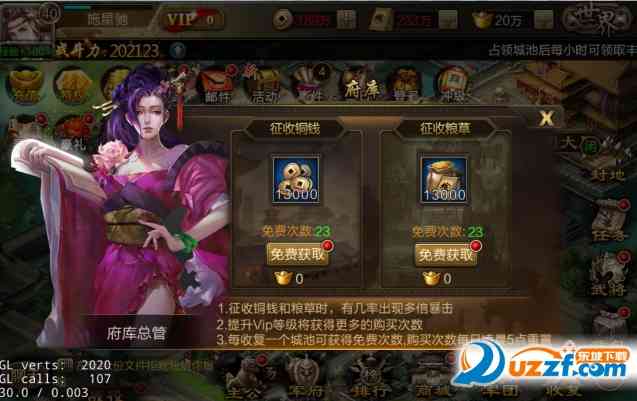 在府库中可征收铜钱与粮草, 每成功收复一个城池,即可获得1次免费征收的次数,征收时还有一定几率使获得的资源翻2-3倍。免费征收次数耗尽之后还可以消耗元宝进行征收。 何苦呢? 需要留意的是游戏中会在固定的日期开放府库双倍活动,此时征收可获得双倍资源。