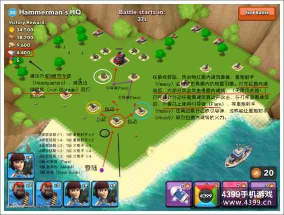 仔细的观察这张图的进攻, 通过在图中的紫点登陆,兵会向红圈内的建筑靠拢,重机枪手会随便吧黑圈内的地雷引爆,打完红圈内建筑后大部分兵会攻击橙色圈内的建筑。 调整一下。 打完之后会自动往蓝圈建筑靠近并攻击。打完蓝圈建筑后 不要马上使用引导弹,等重机枪手往两边散开后放引导弹,这样能让重炮射手吸引白圈内建筑的火力;