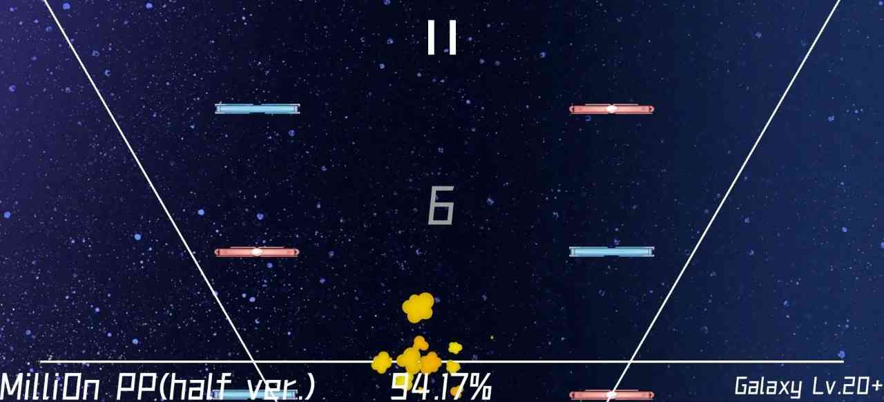杀疯了! 作为音游, 大致游玩模式有了三面下落,与Dynamix不同的是两侧判定线倾斜。note大致三种,没有命名,暂且按Phigros的命名规则,Tap、Drag、Flick。其中Flick不太确定, 判定非常迷,有时手指不动也能判到,有时得手划才能判到,又主要原因是其外观与Phi的Flick外观相似,具有与其他note不同的音效,猜测为Flick。其他note亦与Phi相似,蓝Tap,黄Drag,双押看不明白。