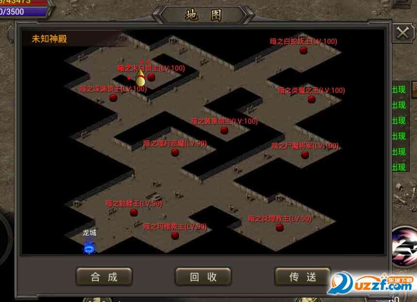 通过龙城平安区的转生神殿NPC进入转生神殿,进入神殿需要消耗转生神殿卷轴。神殿地图狭小, 这里每隔一定时间才会刷一次BOSS, 功力不足。 且每次只刷一只,如此稀有的BOSS必定携带着大量极品装备!