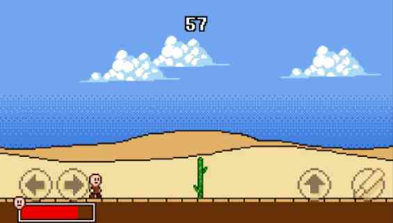 4、右边向上的箭头控制跳跃,棒子图标点击后可以挥动棍棒打飞苹果,呵...。