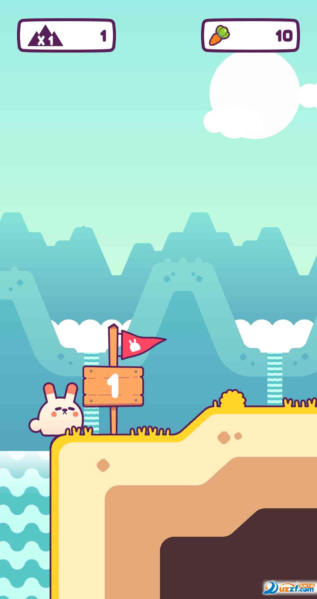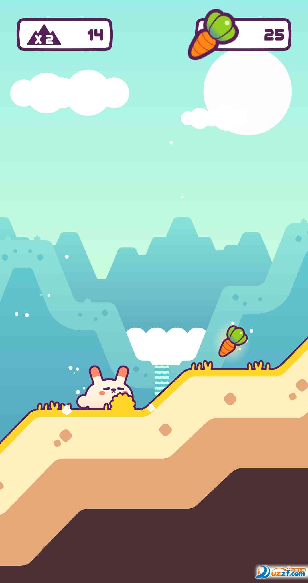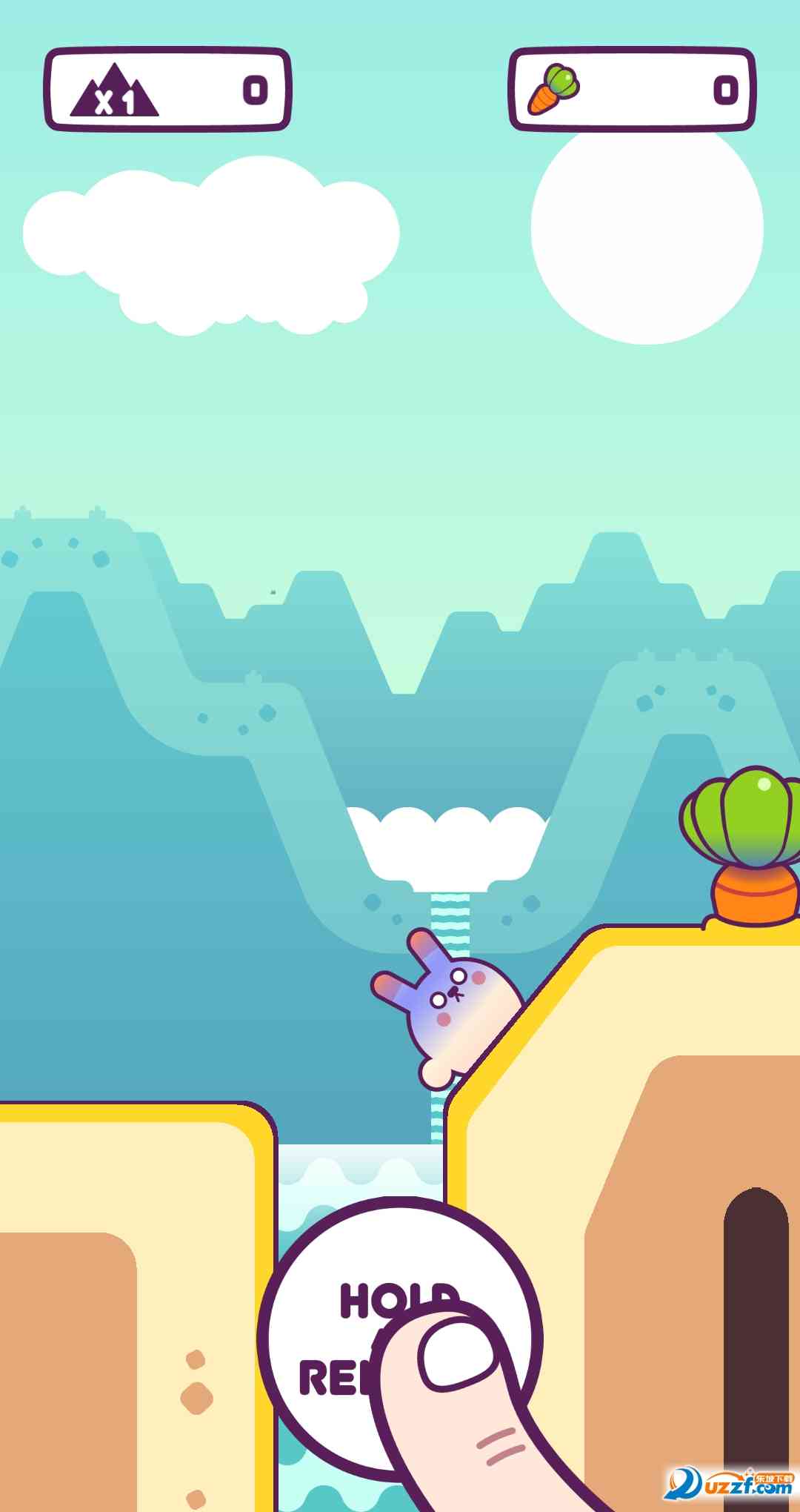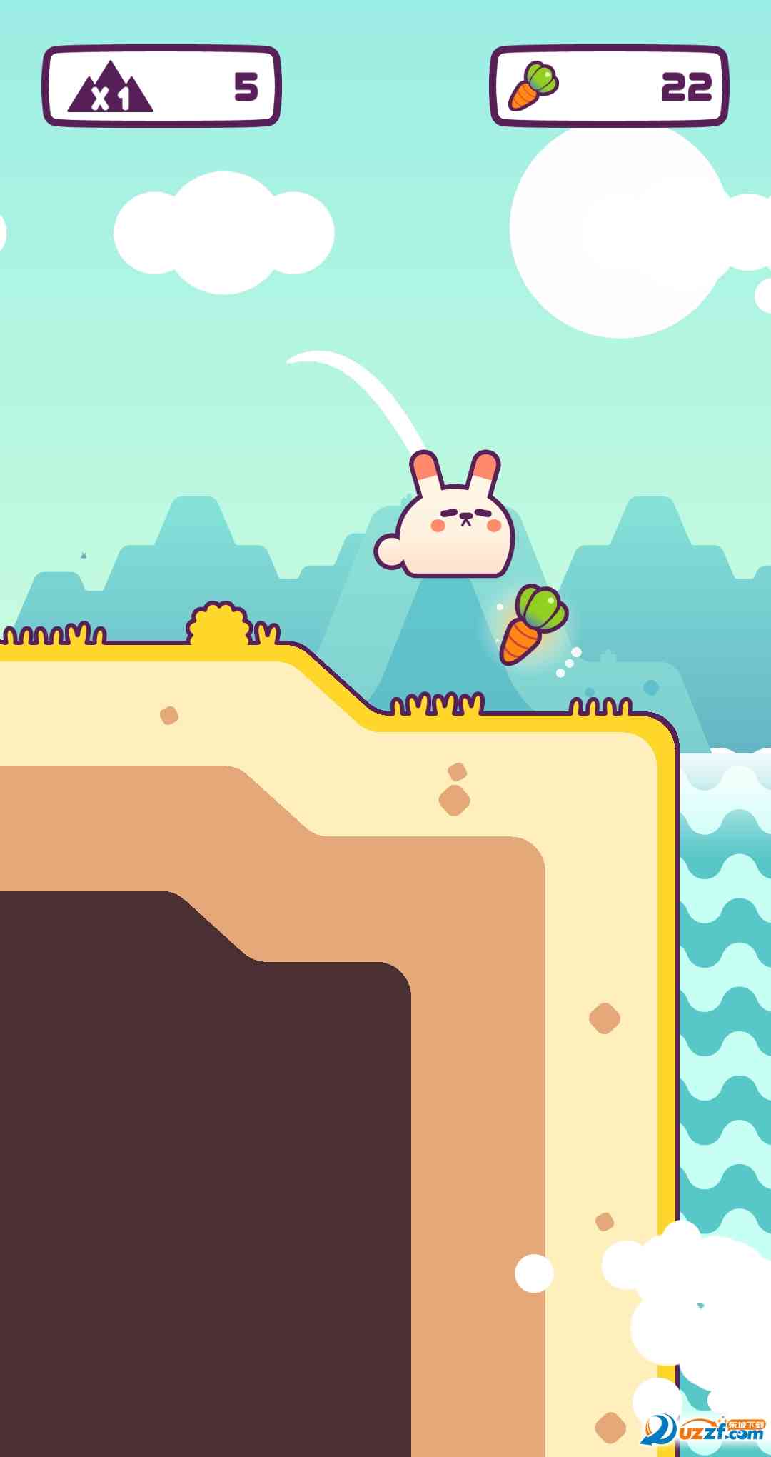玩家需要帮助一个好像受了委屈的肥肥的可爱小兔纸跳跃前进,帮助它吃到更多的胡萝卜。你的前方有很多的斜坡和河流,你需要用合适的力度让兔子跳到平稳的地方不要摔下来。游戏玩法和微信上面的跳一跳类似, 但是没有那么虐心,而且可爱多了哪怕不小心跳错了地方失败了兔子的表情也是非常搞笑的,踩雷了。。