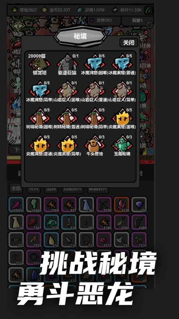 先说说 下面的装备可以看到你掉落的装备,这边建议主要看蓝色词条,这个是装备十分重要的地方,我个人优先建议选择有经验加成的词条,然后通过重铸装备把经验拉到20%,达到最大,凑一个全身经验装备,接着抽一个用来打龙或者爬塔的装备,比如技能暴击伤害和攻击速度之类的,最好是想要自己要玩普攻还是技能,单一的走一条路线强点。不要金币反震血量和防御词条,这些在后期完全没用。