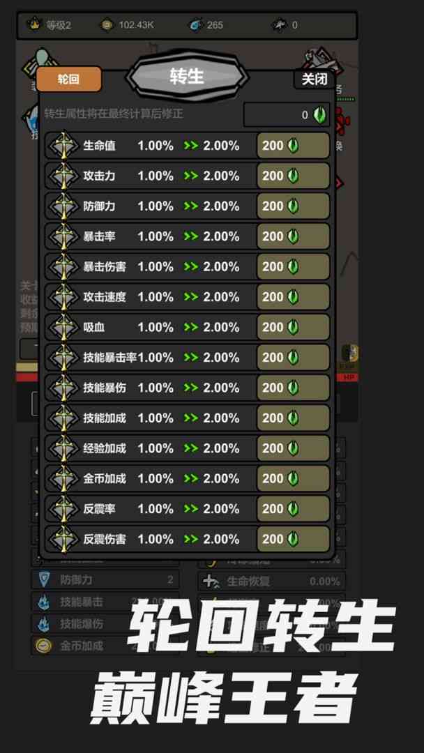 试着... 一百级以后开始有转生点, 我是全点经验的,反正不点金币血量反震防御就行,个人认为经验最优解。转身后所有装备御灵技能等级变成零级,灵等级不变,技能强化不变。灵魂金币装备碎片清空,锁龙塔层数不变。建议300级转第一次这个时候就有点升不动了。