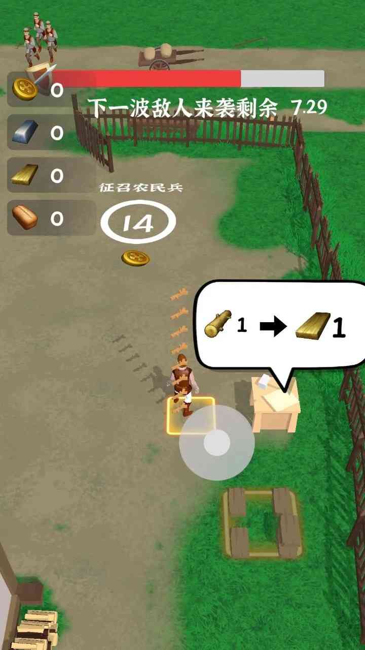 2、砍树、加工木板、卖面包、挖矿。一刻也停不下来辛苦攒下来的金币, 官宣。 全部用来招募农兵抵抗60s一波的敌人来袭。