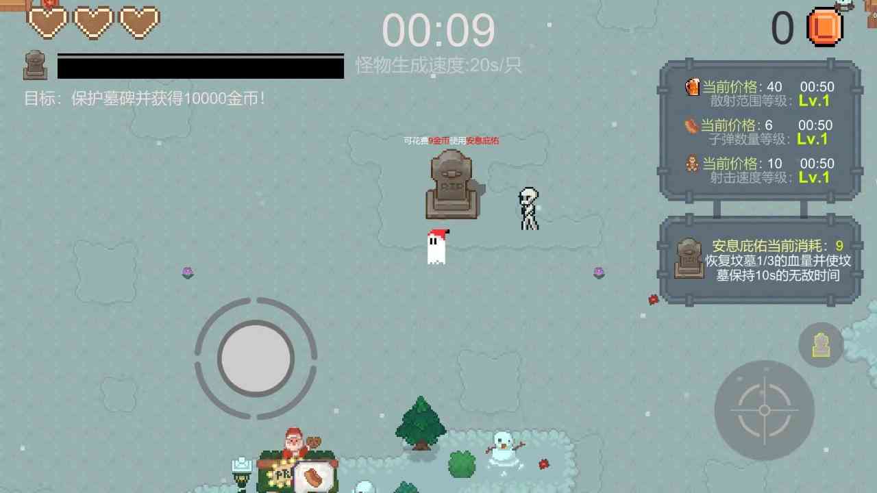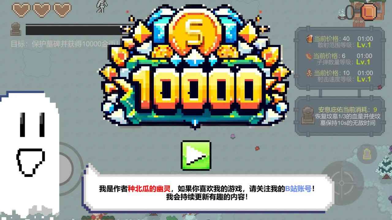YYDS... 角色扮演动作冒险游戏《一万金币!》是个人up主开发的肉鸽游戏,可爱小幽灵的守塔之旅。游戏主角是红帽小鬼,它要靠射击对抗无尽的小骷髅兵,击败骷髅兵后能得到金币,攒够10000金币通关。左手移动和右手射击的典型设置。有足够金币的时候还可以点击右手边的小墓碑,让真正的墓碑获得回血和无敌效果。