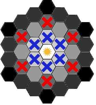3)短距扫描仪,开图用,新手前期容易弃号的罪魁祸首之一,建议用如下图的雪花状摆放方式,后期最为美观,不然容易后悔。作用是开图, 每一个扫描仪都有机会开出一颗星球, 我当场石化。 但要注意的重要一点:殖民最开始的两颗星球后放弃第3、4颗星球,从第5颗开始再殖民,下边会说原因