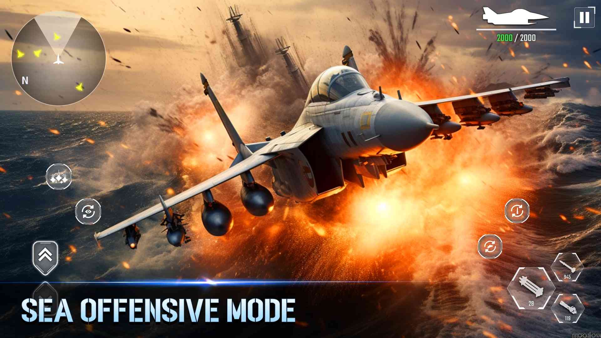 C位出道。 4、 您可以在攻击其他敌方空军喷气式飞机时控制自己的速度,在这个空袭游戏中,控制非常容易。