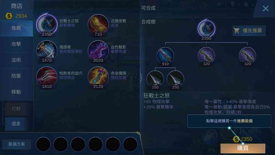 简易的装备系统:游戏内设有装备推荐方案,并支持在游戏过程中随时购买和出售装备。一边,大部分时间玩家只需要专注于对线和团战,操作门槛相对友好。