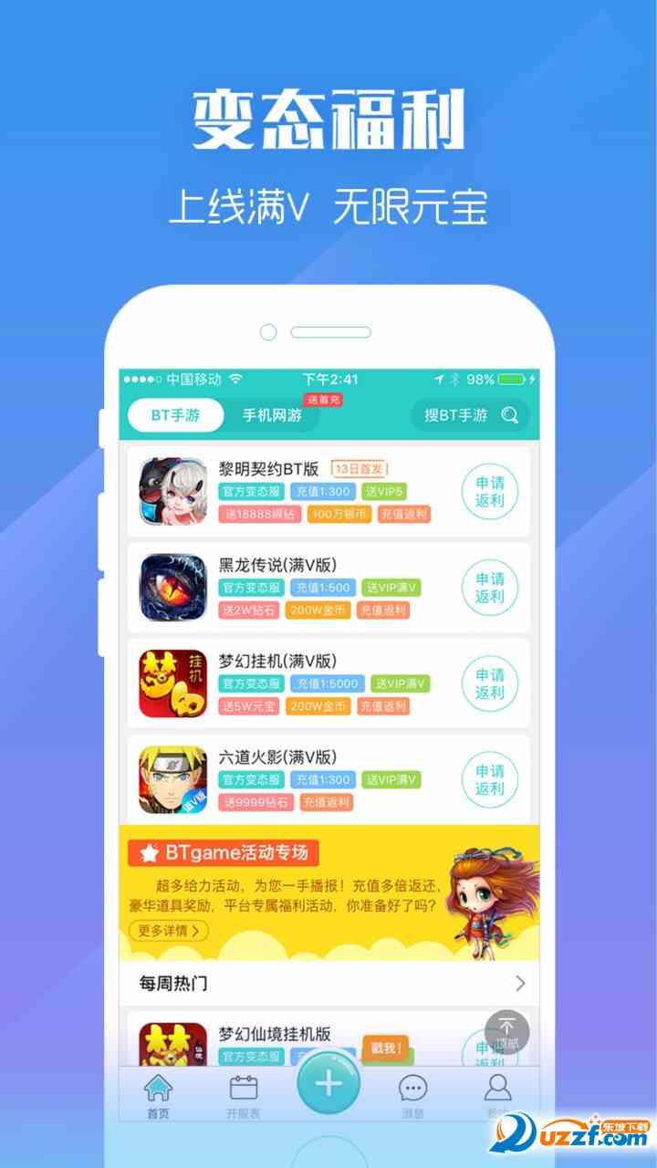 大胆一点... 变态手游, 简称BT手游,是指由研发授权推出的手游特色福利专区,通过免费赠送VIP和元宝,调整爆率,提高充值比例等方式,从而达到让玩家快速提升游戏体验的目的。