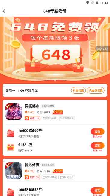 换个角度。 2、 然后进入648专题活动界面每个星期可以领取3张,每周一11点更新游戏福利,福利力度挺强的。