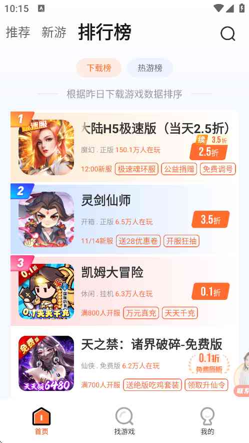 2、进入到软件首页。如图所示, 这里能提供最热最新的游戏推荐,可以查看游戏排行榜