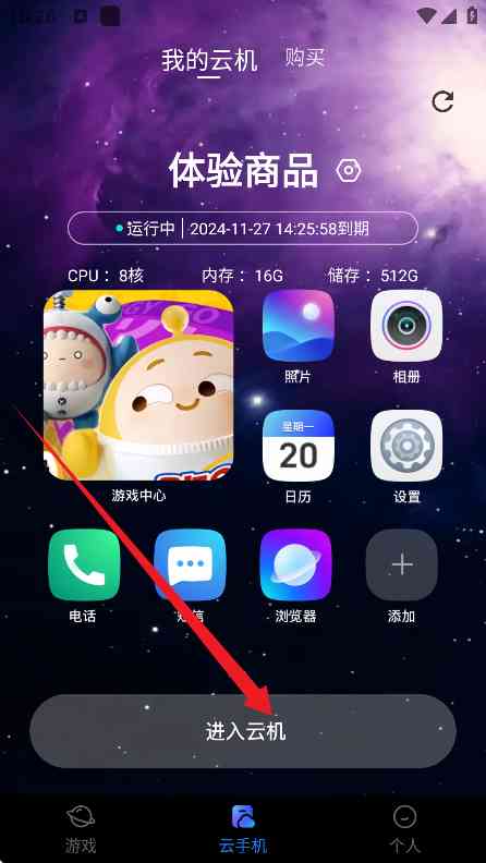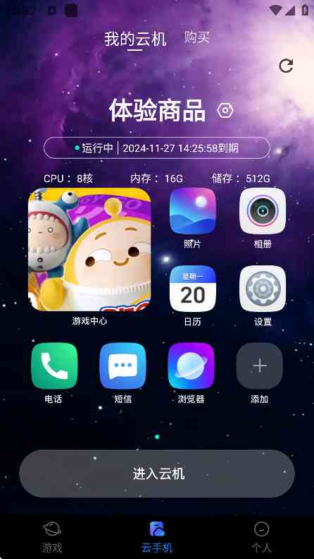 1、 下载安装好这款星云游戏云手机APP,然后打开,呃...。