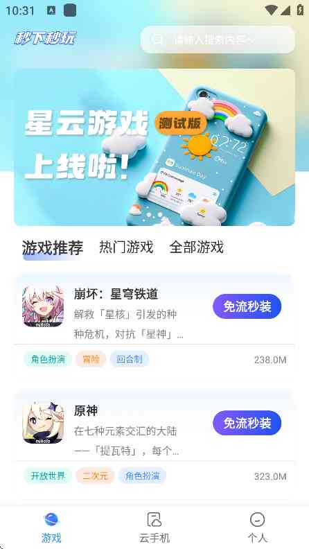 2、节省了大量的本地存储空间,让用户的手 一阵见血。 机不再因游戏安装过多而出现存储不足的问题。