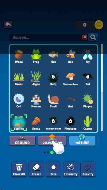 1、 游戏中包含了奇奇怪怪的各种物体,如种子、弹力球、克隆、蚂蚁、病毒、熔岩、汞、激光、肥皂水等,玩家可以随意组合它们,产生意想不到的后来啊。
