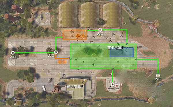 【机场】机场的隐藏补给位于地下,需要安放两根保险丝。地下给人感觉结构比较混乱,我画了张图帮助大家理解。这里总共有5个入口通往地下,蓝色绿色区域均表示隐藏补给区域,绿色区域使用绿卡进入,蓝色区域使用蓝卡进入。橙色区域刷新红色油桶较多,无需卡片。