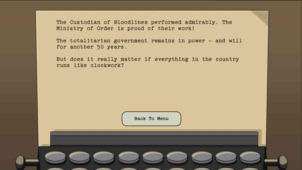 没眼看。 沉浸极权主义国家和无懈可击的官僚机构隐藏着深重秘密。您是产房的血统守护者,一场大火烧毁了所有记录,现在您的任务是手动将新生儿与父母进行匹配。