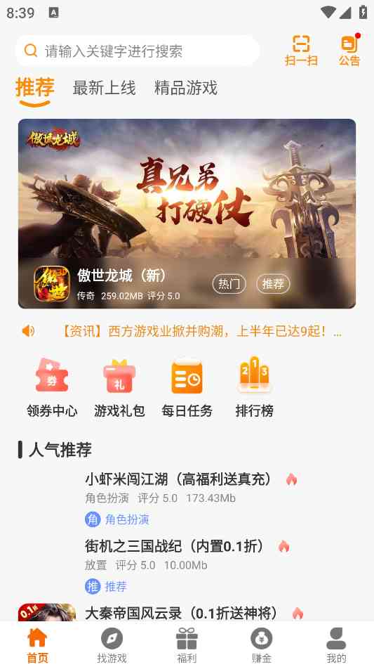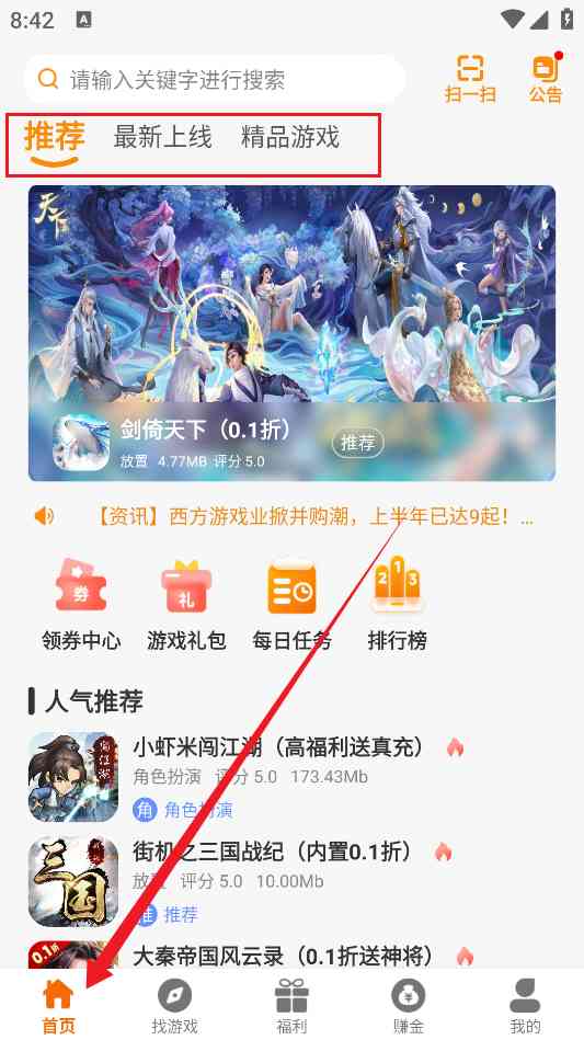 1、 打开APP,进入到APP首页,在首页可以看到丰富的游戏资源,