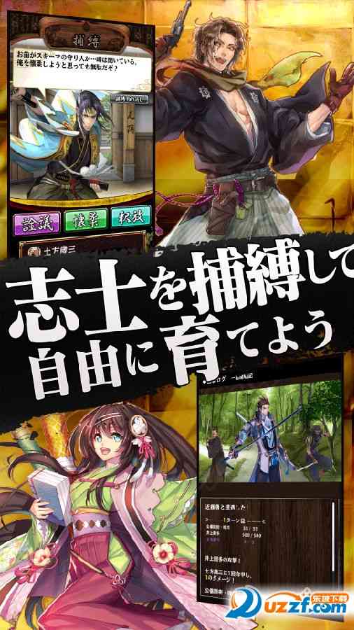 谨记... 本作是一款放置型的RPG游戏, 玩家在游戏中可以收集到100多位不同的幕末志士,将他们组成自己喜欢的战队。游戏中玩家需要将自己的角色组成小队, 让他们自己前去战斗,在战斗的一边收获经验和战利品,不断的提高自己的实力。